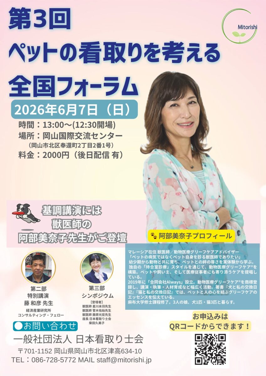 2025年11月29日 2026/06 第3回ペットの看取り全国フォーラム@岡山 開催 来年、2026年に「第3回 ペットの看取りを考える全国フォーラム」を開催いたします。 今回は本部がある岡山での開催となり、これまでペットフォーラムにご出演いただいた獣医師の先生方も再びご登壇くださいま 記事を読む 2025年09月13日 看取り学通信講座 学割セット販売 📀 あなたのご都合に合わせて学べる「看取り学 通信(DVD)講座」に、このたび学生割引が初登場しました! 🔰 初級講座:基本的な死生観について学べます 🌱 中級講座:旅立つ方へのアプロー 記事を読む 2025年08月15日 [43%引/対面OK] 看取り学講座 特別キャンペーンのお知らせ 現在ご好評いただいている看取り学セット受講ですが、このたび全国の看取り学講師とともに、対面講座でも特別キャンペーンを実施いたします。 8月15日まで実施していた通信講座セット割引に続き「 記事を読む 2025年07月14日 12/20・岡山県・みとりし上映会&Yaeコンサート(限定180席) 12月20日(土曜日)、下記の要領にて、映画「みとりし」上映会と、歌手のYae(やえ)様のコンサートを開催いたします。 もうひとりの家族として「抱きしめて看取る」実践を重ね 記事を読む 2021年07月18日 新型肺炎で亡くなられた方と突然の別れをなさった方へ 日本看取り士会からのメッセージです。(PDF版もございます) お問合せ先: 一般社団法人日本看取り士会 TEL 086-728-5772 FAX 086-239-3992 Mail staff@mit 記事を読む