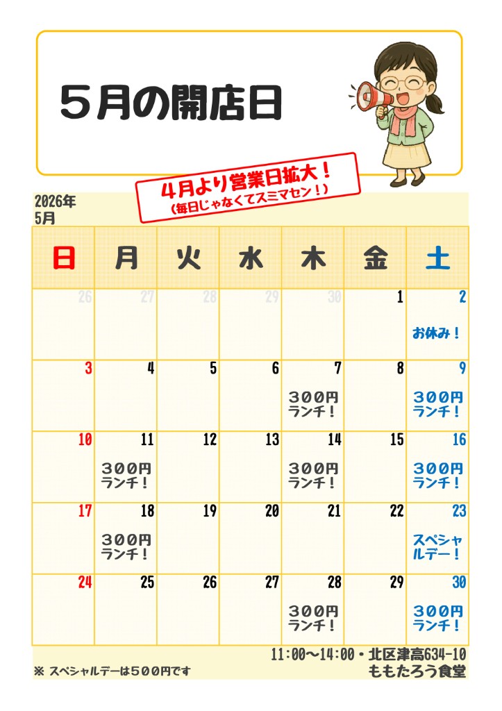 なお、5月2日(金)はお休み、5月23日(金)はスペシャルデーの予定です。